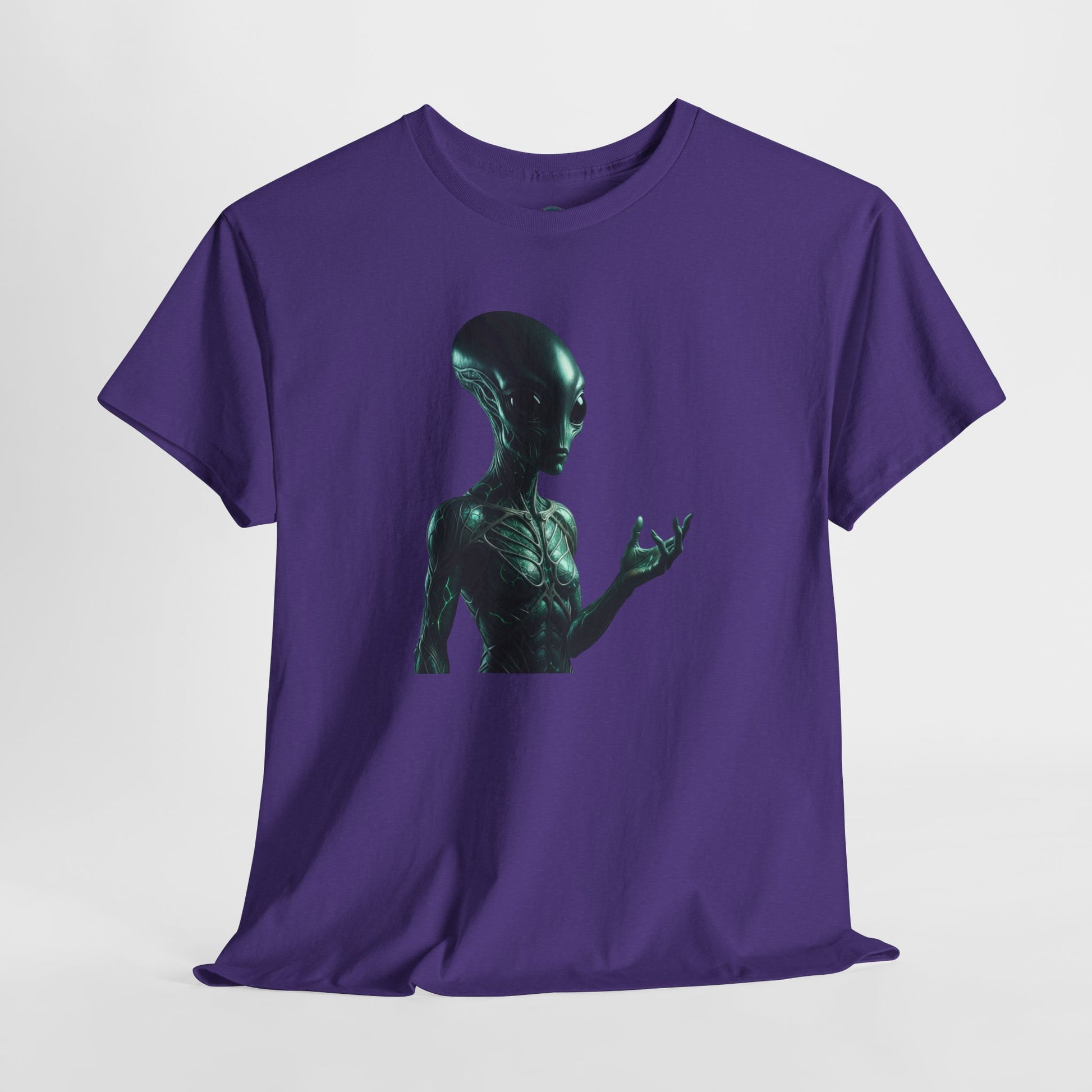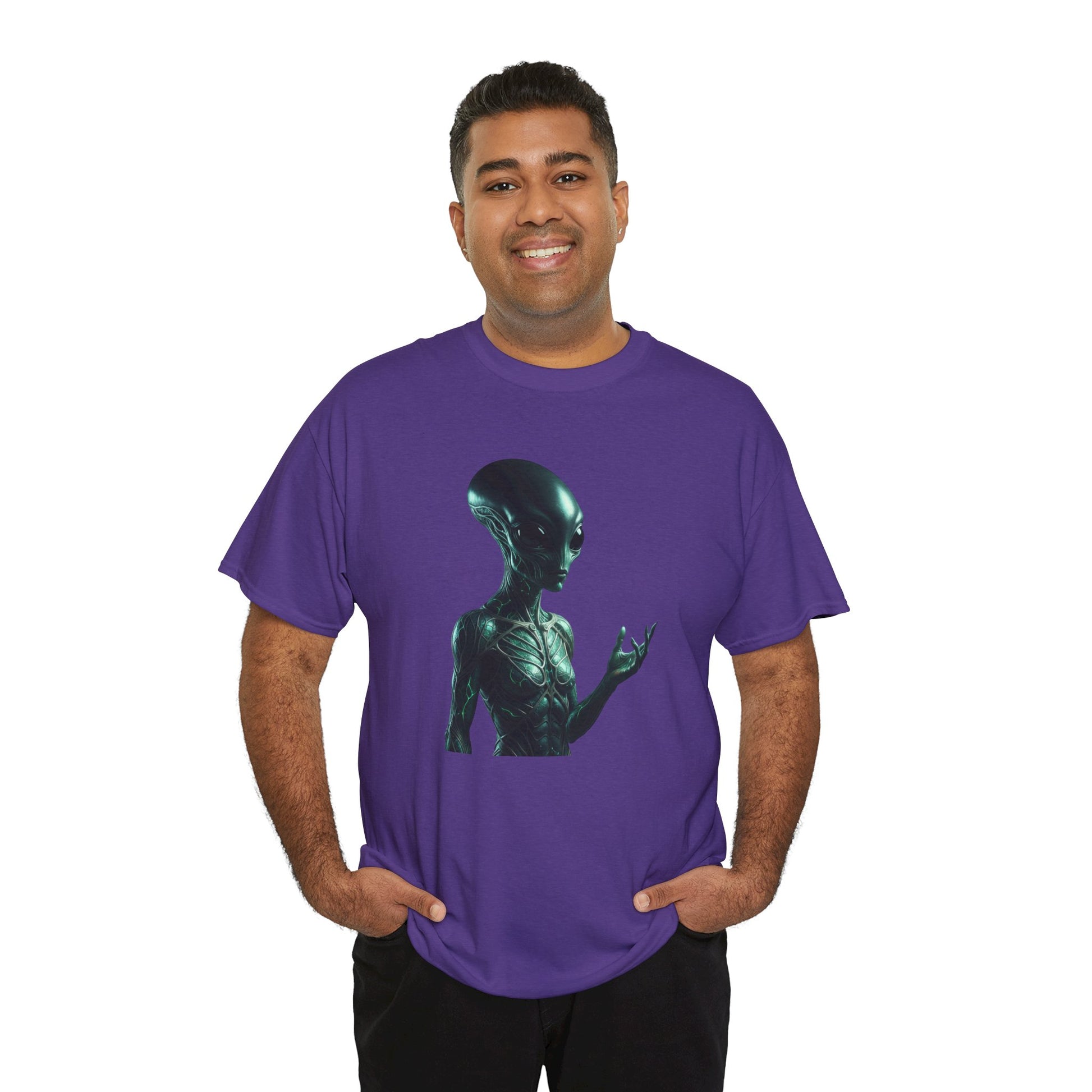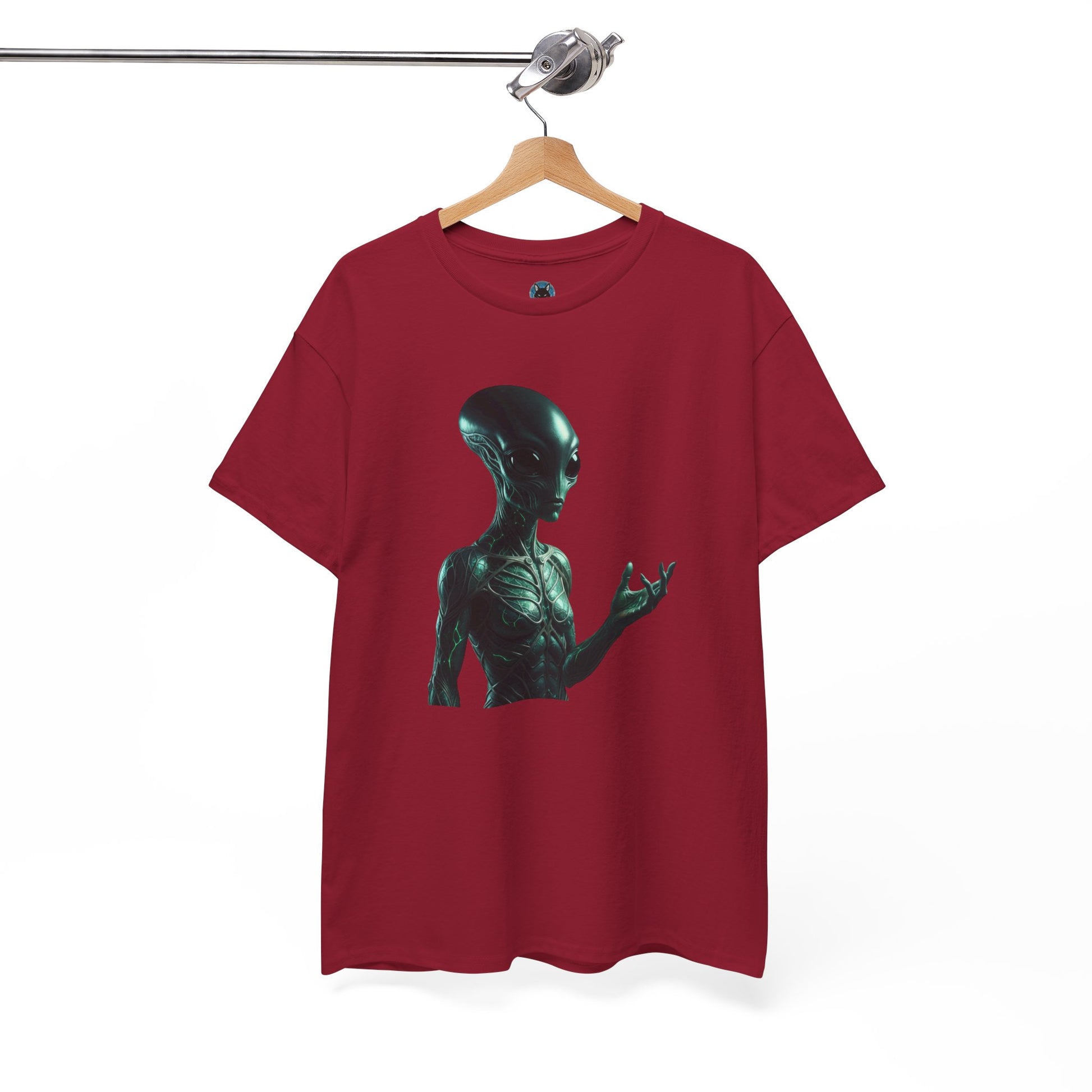 This alien T-Shirt exudes a quirky and fun vibe, perfect for sci-fi enthusiasts and those with a playful sense of style. It is ideal for casual wear and can be a conversation starter at events or gatherings. Relevant for sci-fi conventions, movie nights, and comic book enthusiasts.