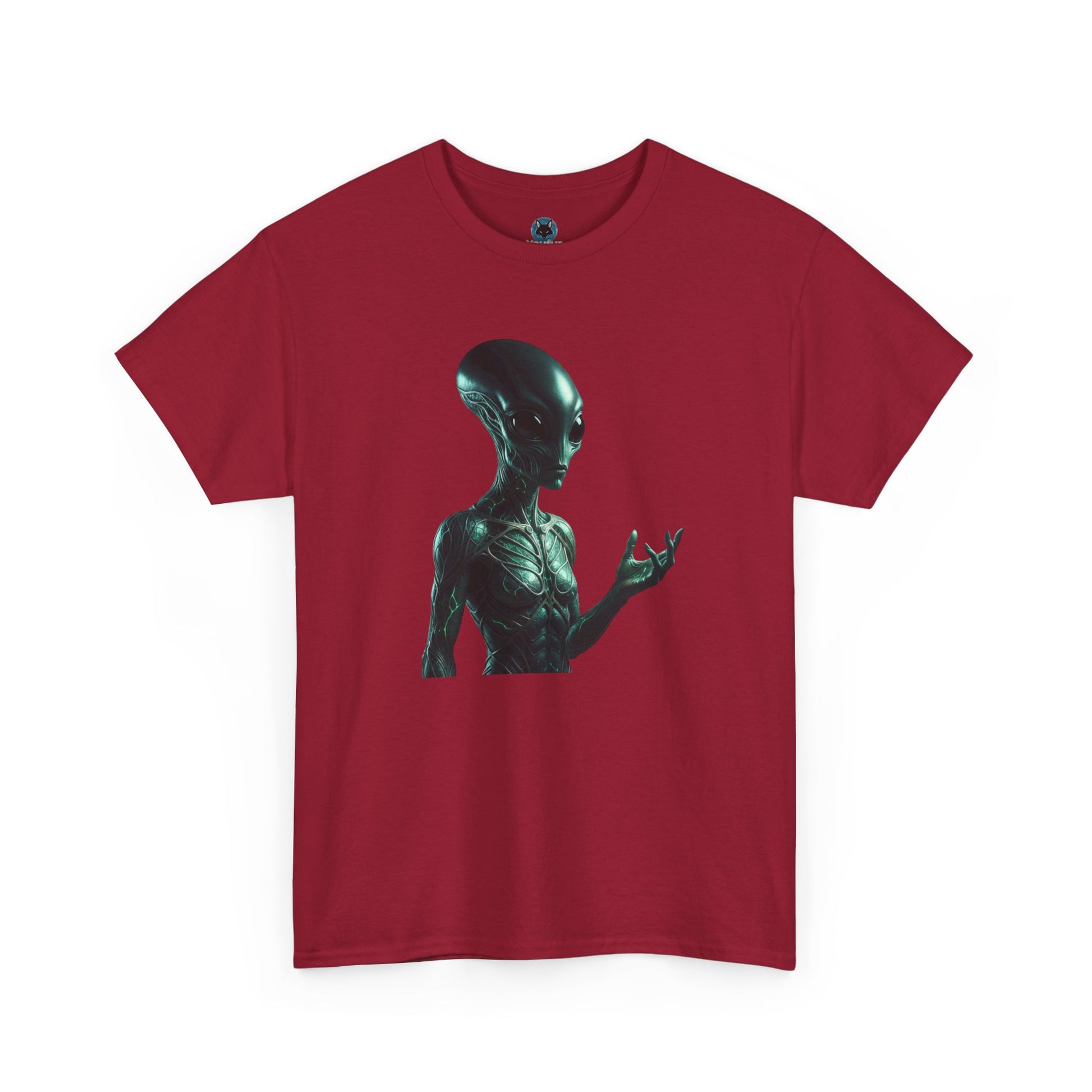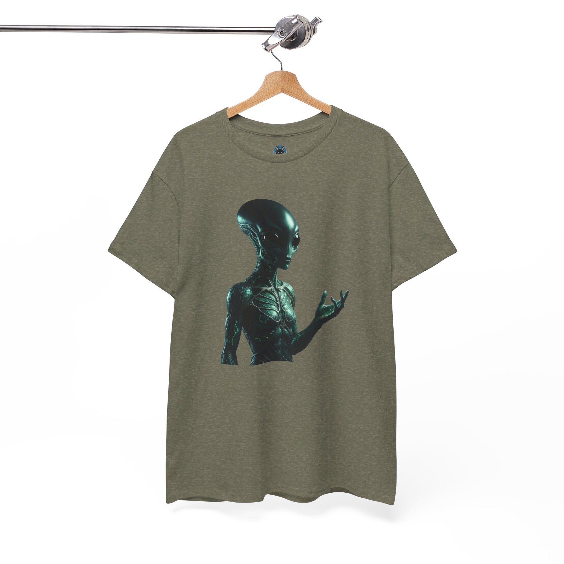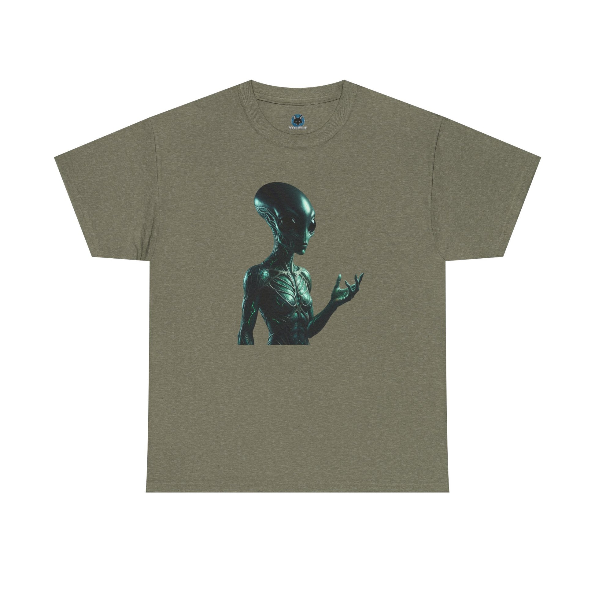 This alien T-Shirt exudes a quirky and fun vibe, perfect for sci-fi enthusiasts and those with a playful sense of style. It is ideal for casual wear and can be a conversation starter at events or gatherings. Relevant for sci-fi conventions, movie nights, and comic book enthusiasts.