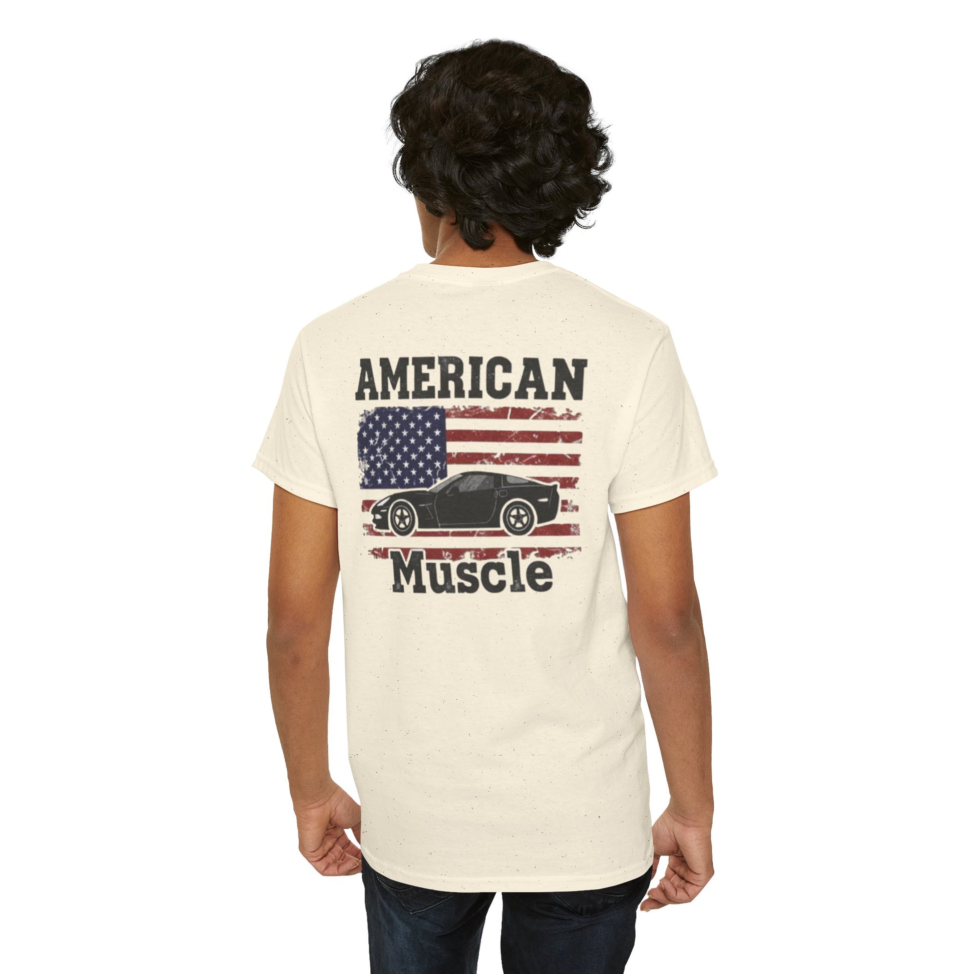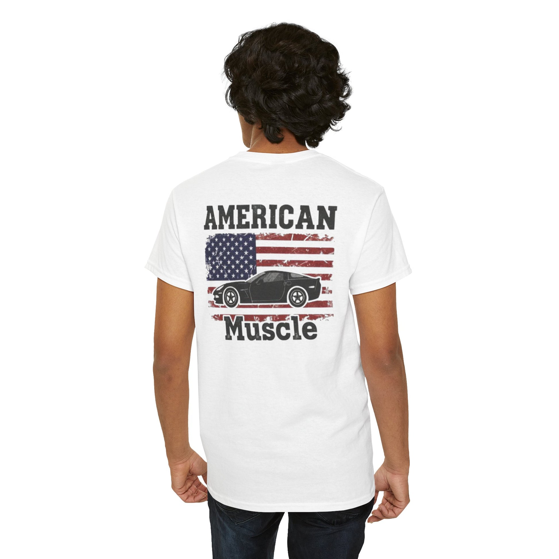 Iconic Imagery: The bold text "AMERICAN" and "Muscle" frames a detailed profile of a C6 Corvette, making it instantly recognizable to car enthusiasts.
