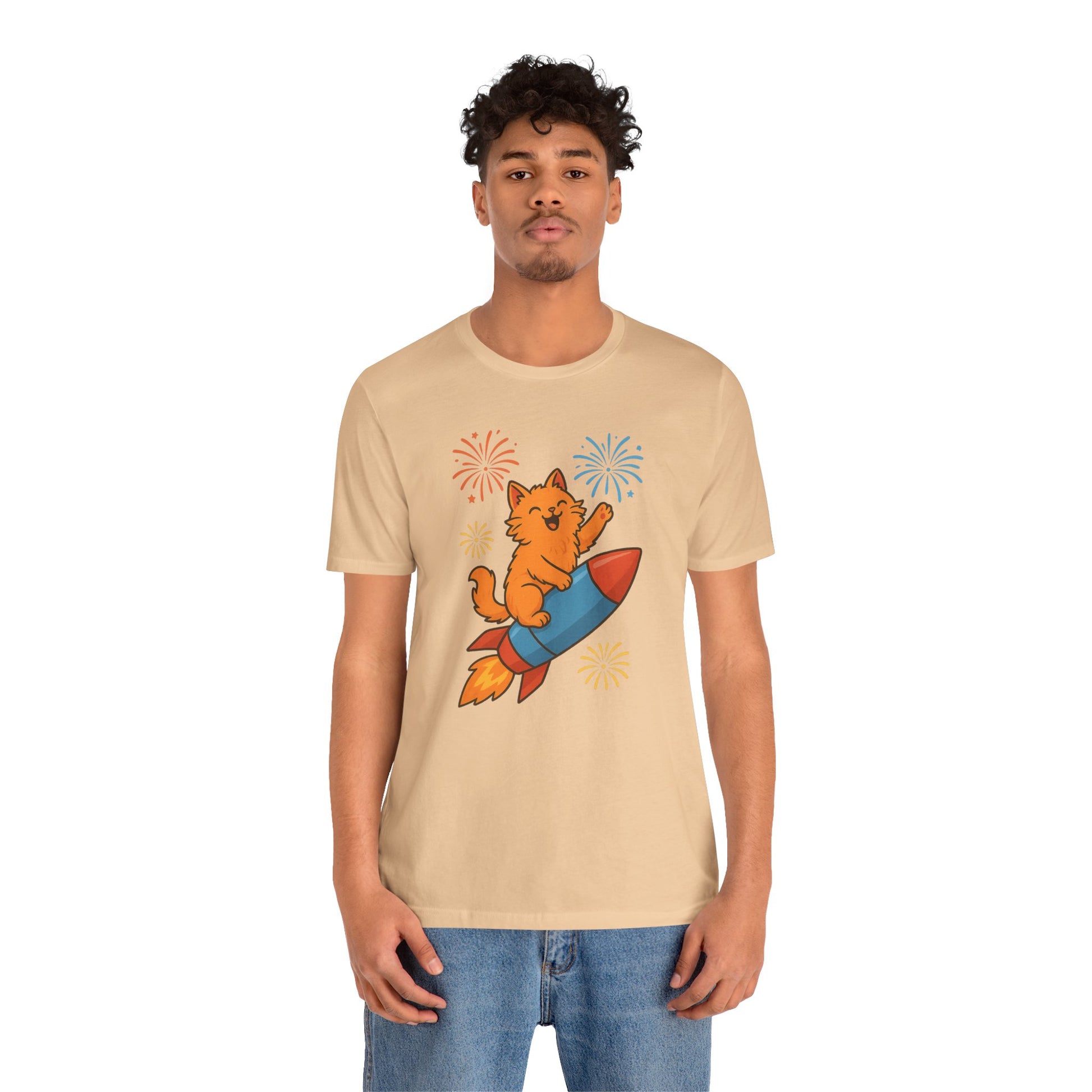 A comfortable unisex T-Shirt featuring a cartoon cat riding a rocket, giving off a playful and vibrant vibe. Perfect for cat lovers and those who enjoy fun and whimsical designs. Ideal for casual wear, lounging, or as a statement piece during holidays and events.