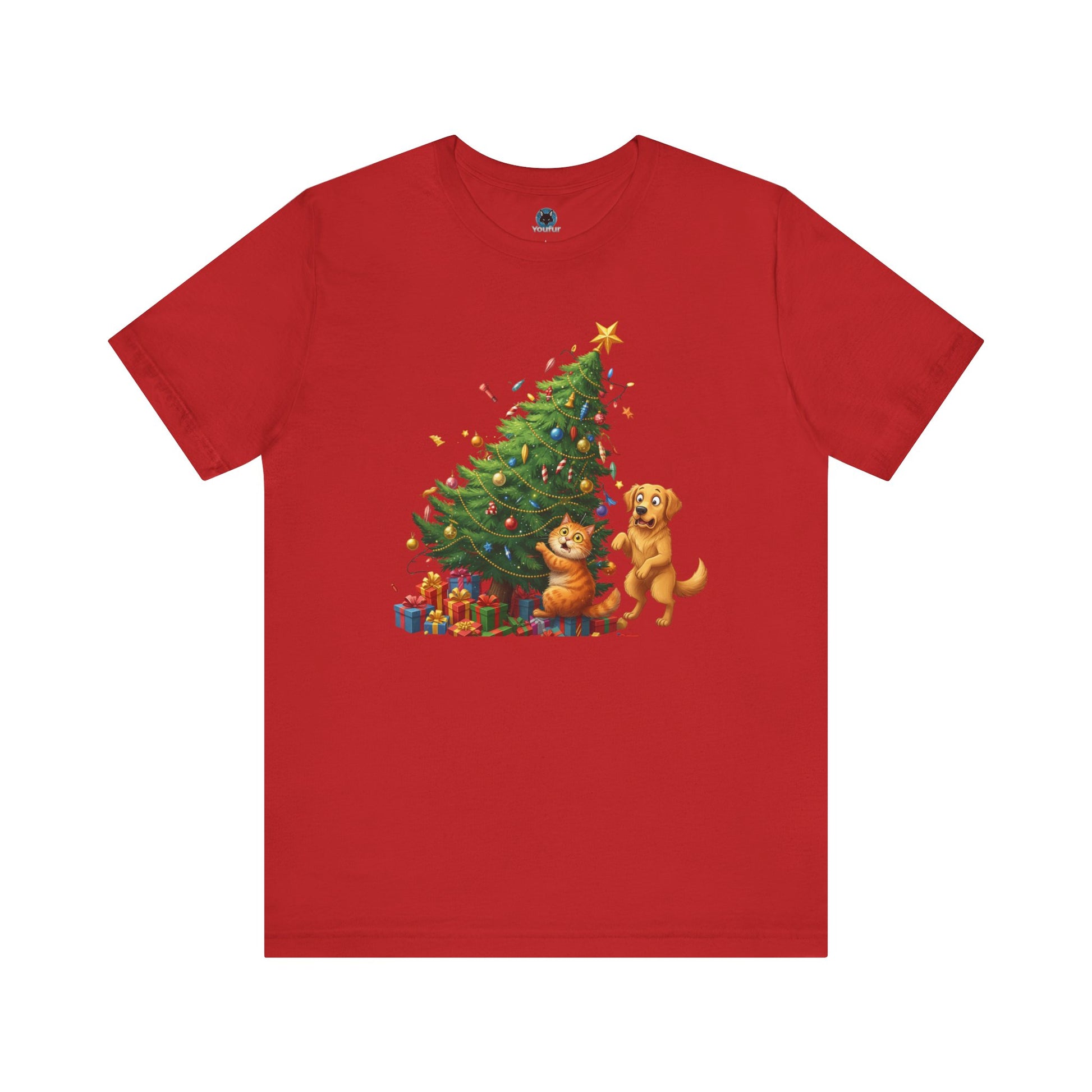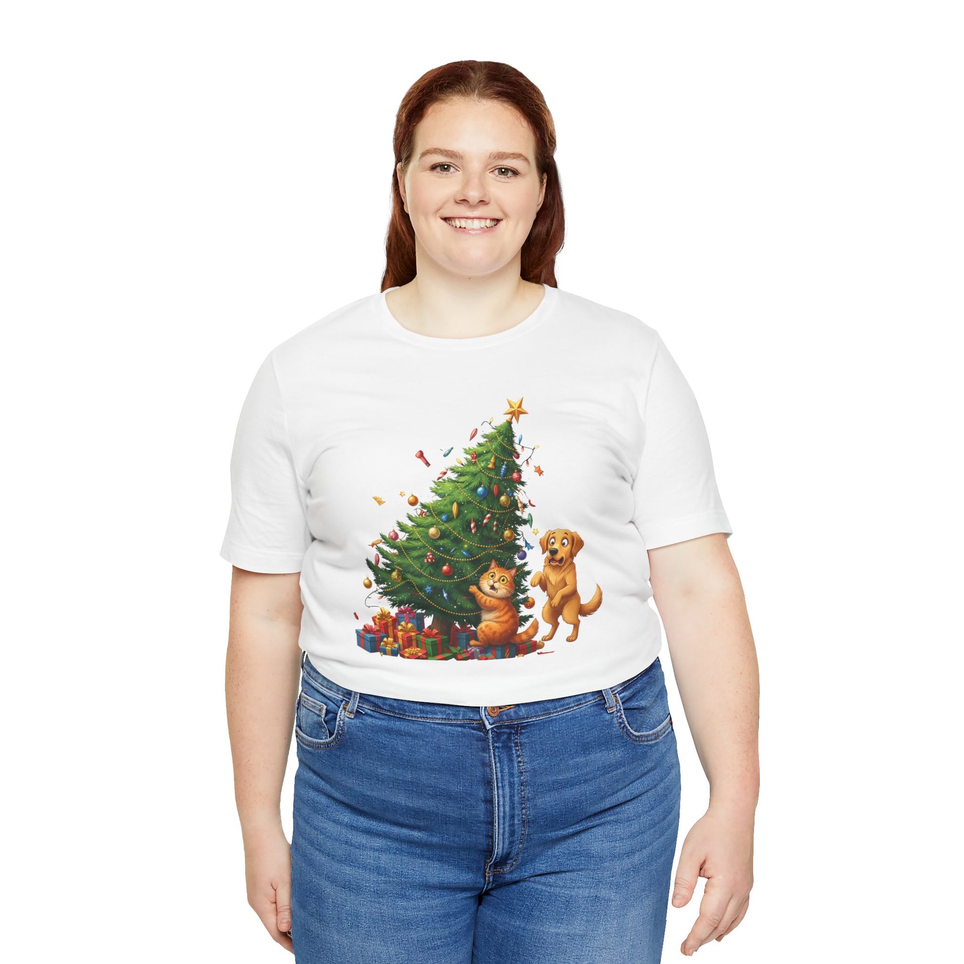 This cat knocking over a Christmas tree with a dog watching T-Shirt exudes a playful and mischievous vibe, perfect for those who enjoy humorous and festive designs. It is ideal for anyone looking to add a touch of holiday spirit to their wardrobe or to gift to a friend who loves cats and dogs. Relevant for Christmas, pet lovers, and casual wear.