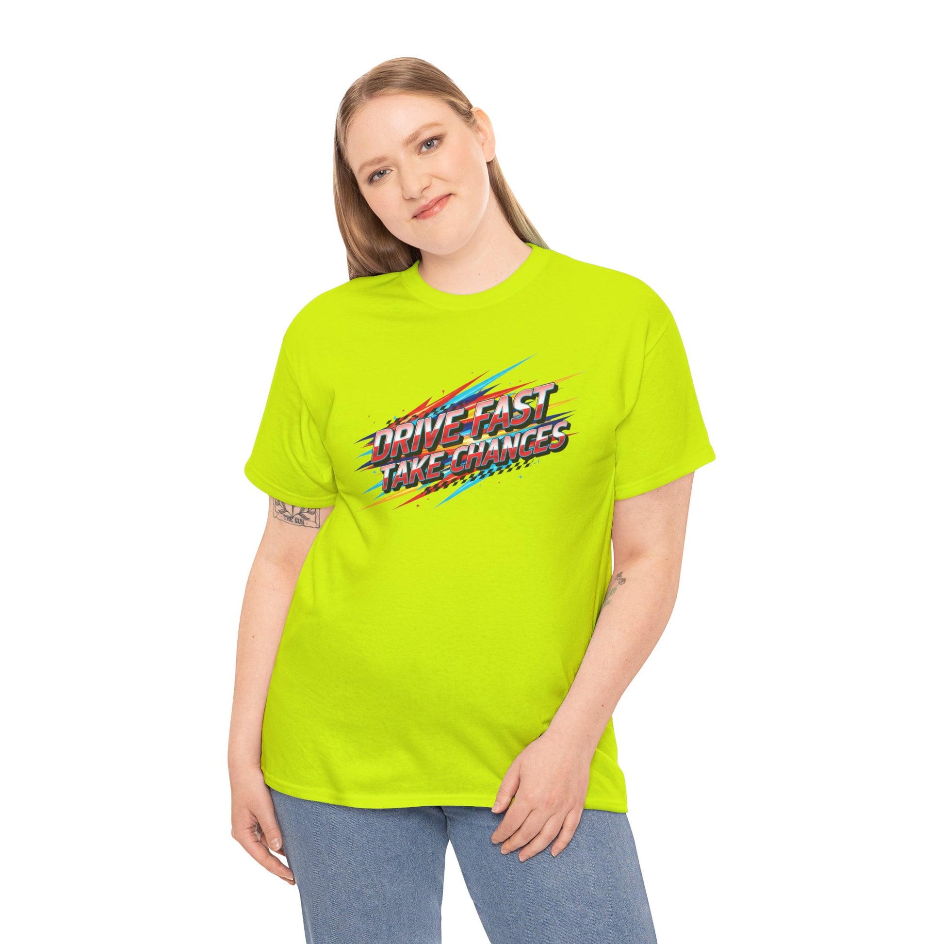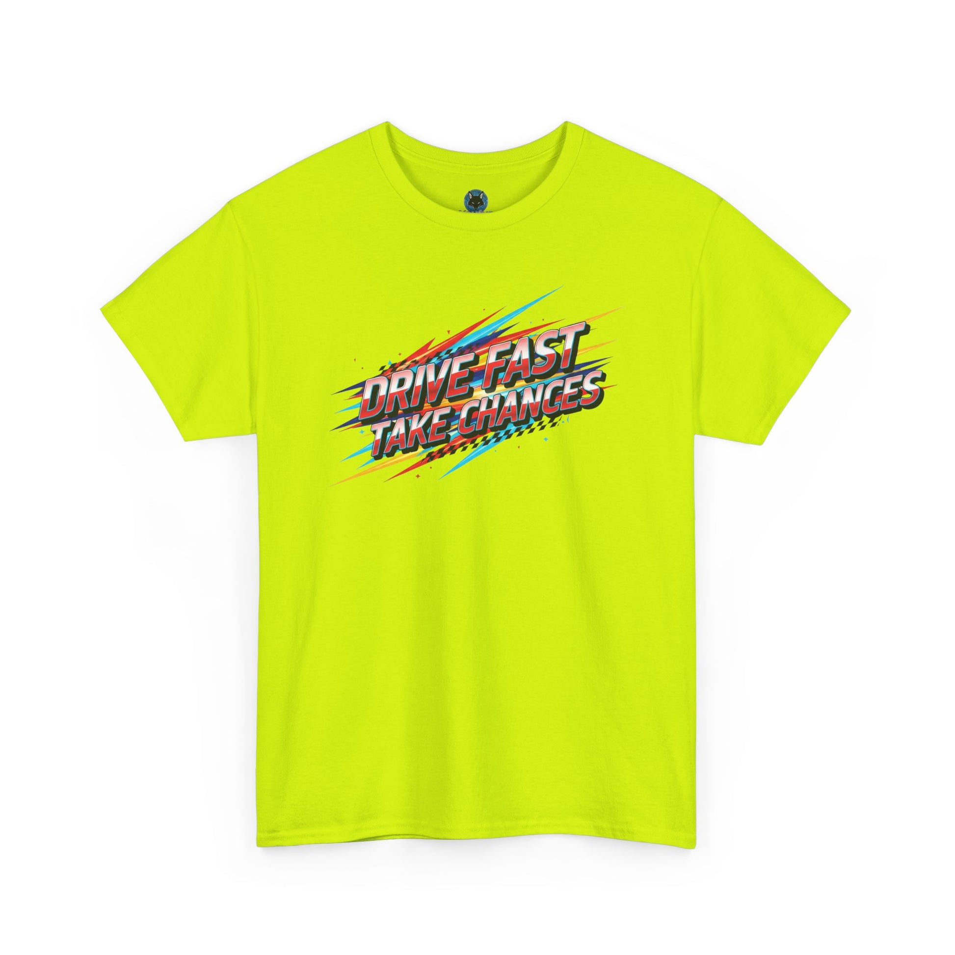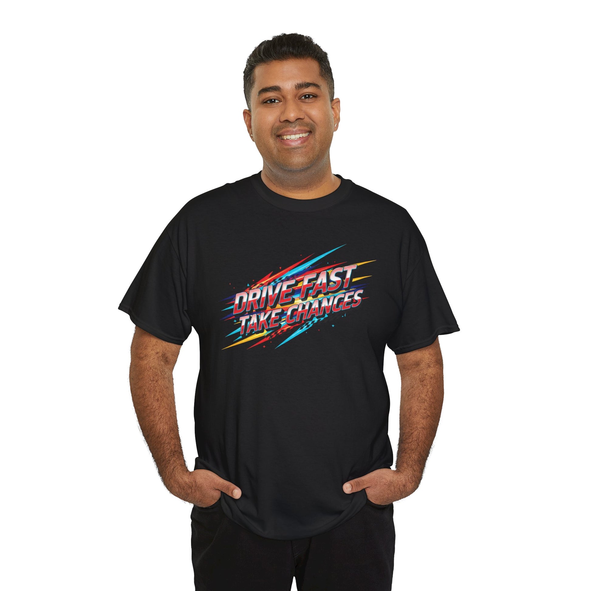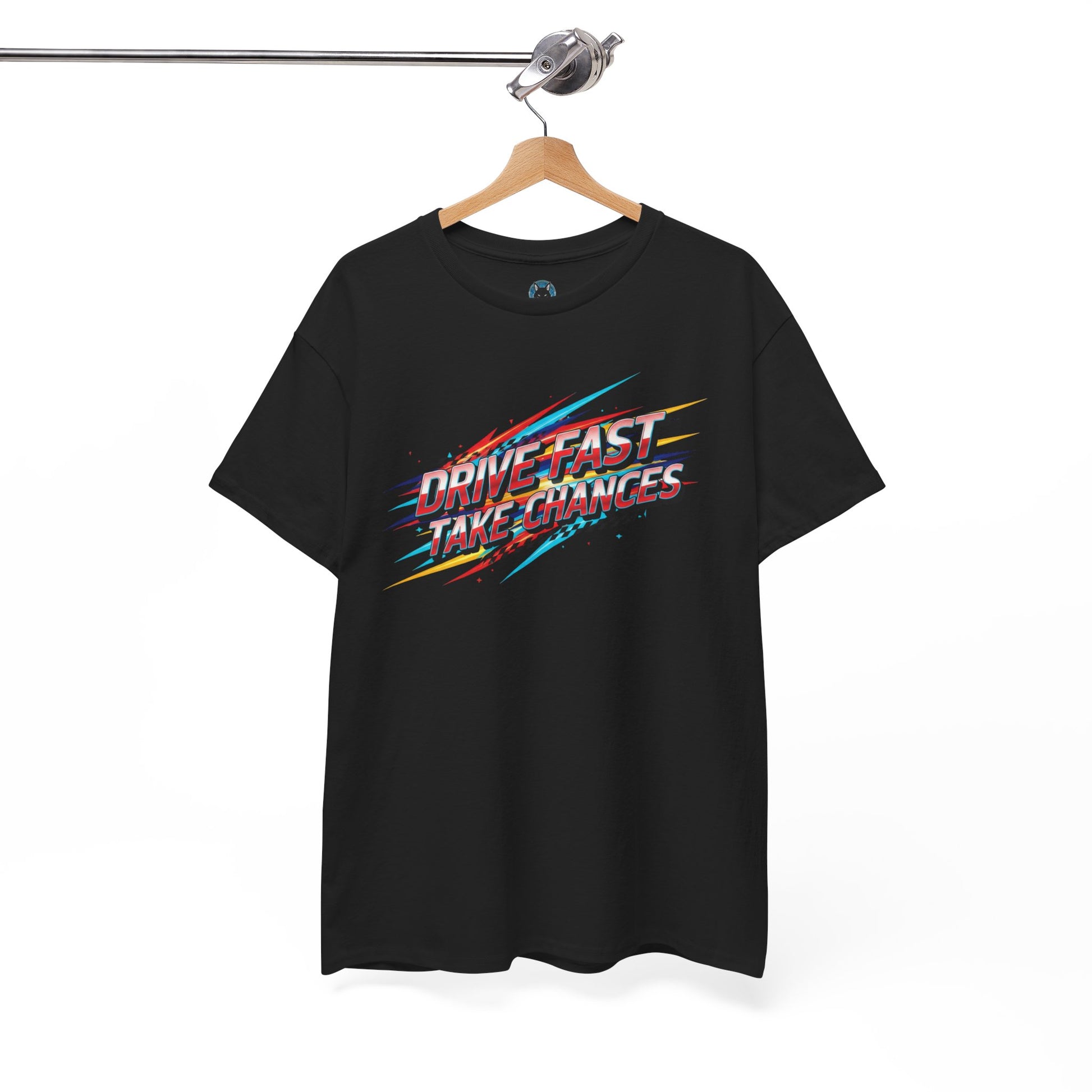A drive fast take chances T-Shirt perfect for adrenaline junkies and risk-takers. This tee exudes a rebellious and adventurous vibe, ideal for casual wear or weekend outings. It is relevant for fans of motorsports, car enthusiasts, and thrill-seekers. Perfect for gifting on birthdays, Father's Day, or as a fun surprise for someone who loves speed.