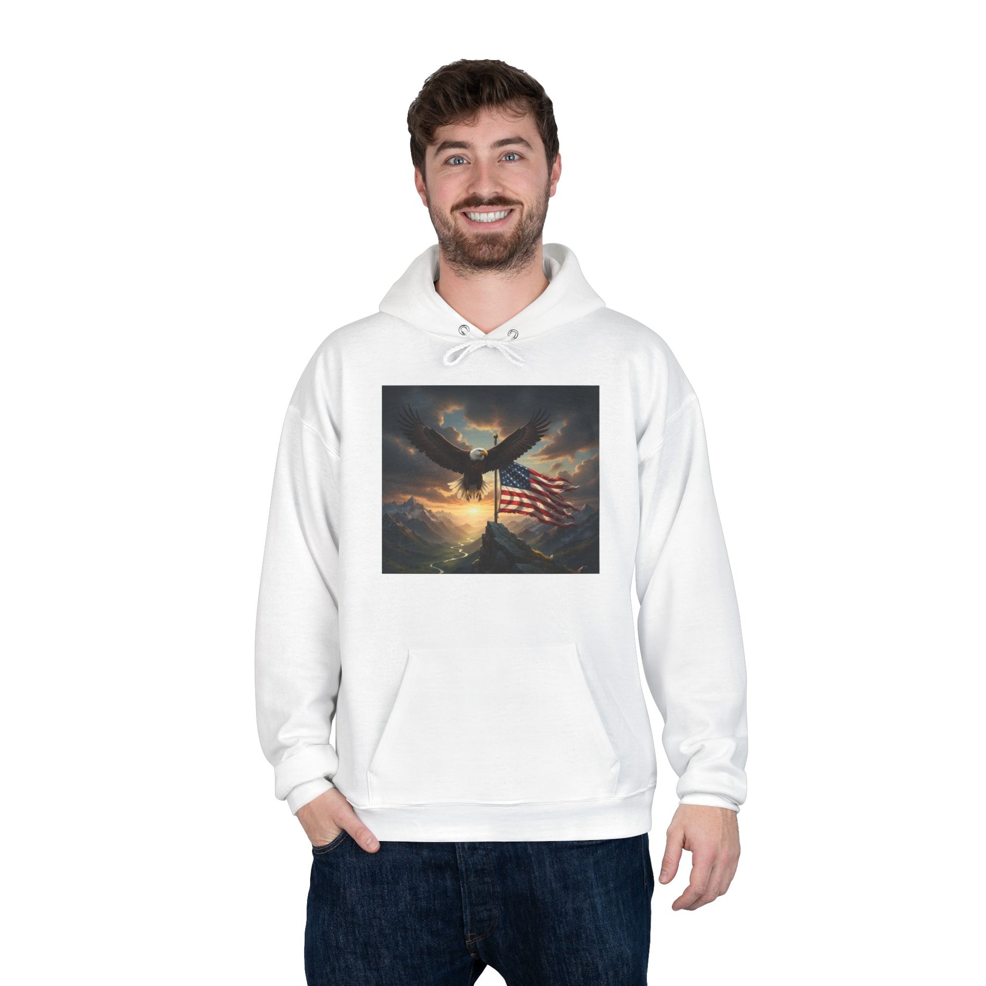 This patriotic eagle flying by an American flag hoodie gives a strong and proud vibe, perfect for those who love their country. It's great for celebrating Independence Day, Memorial Day, Veterans Day, and Fourth of July. The unisex design makes it suitable for anyone looking to show their American pride.