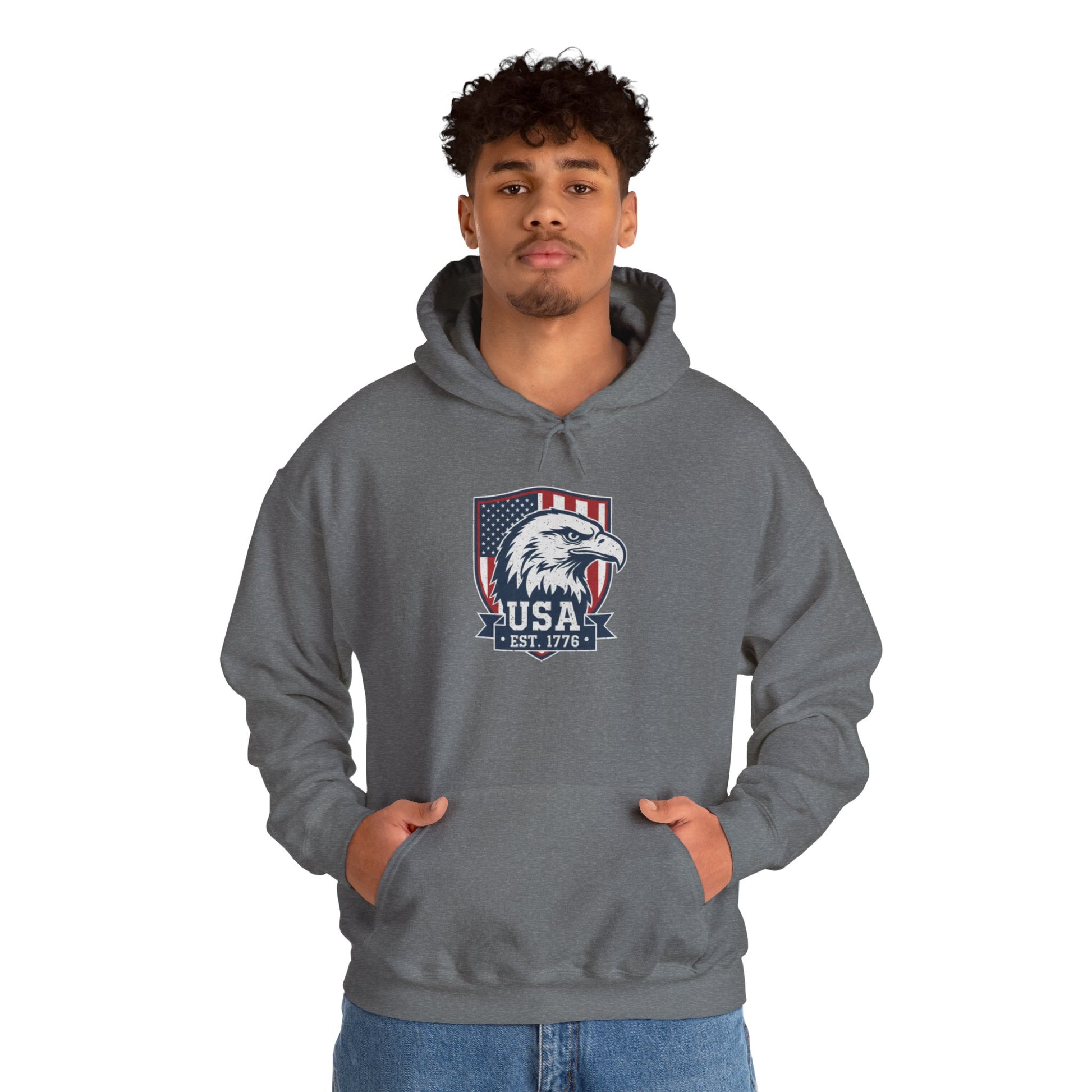 A patriotic hoodie perfect for showing off your pride and love for your country. This cozy sweatshirt features a kangaroo pouch pocket, an adjustable hood, and a classic fit for maximum comfort. Ideal for adults who want to celebrate patriotic holidays and occasions.