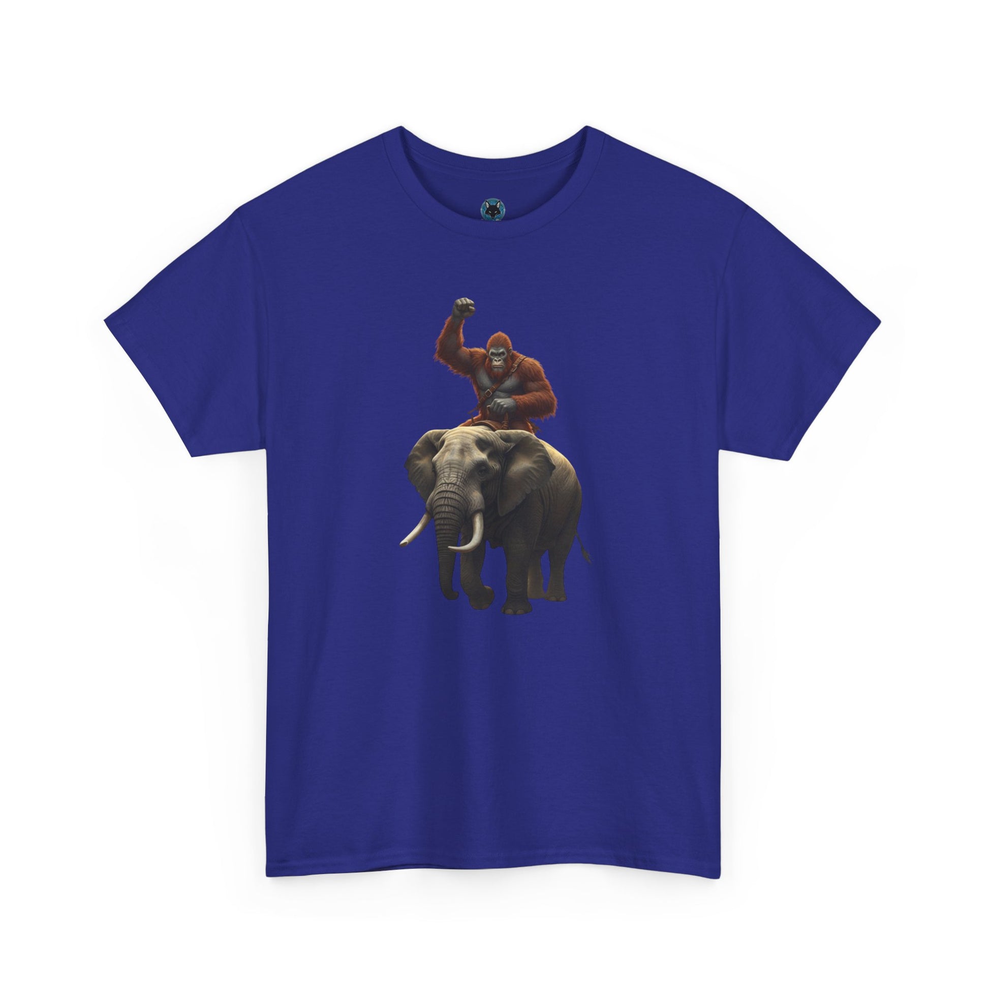 A unique and quirky T-Shirt featuring a design of Bigfoot riding an elephant. This tee is perfect for those who enjoy fun and whimsical styles. It can be worn casually or as a conversation starter at gatherings and events. Ideal for adults looking to inject some humor into their wardrobe, especially for themed parties or casual hangouts.
