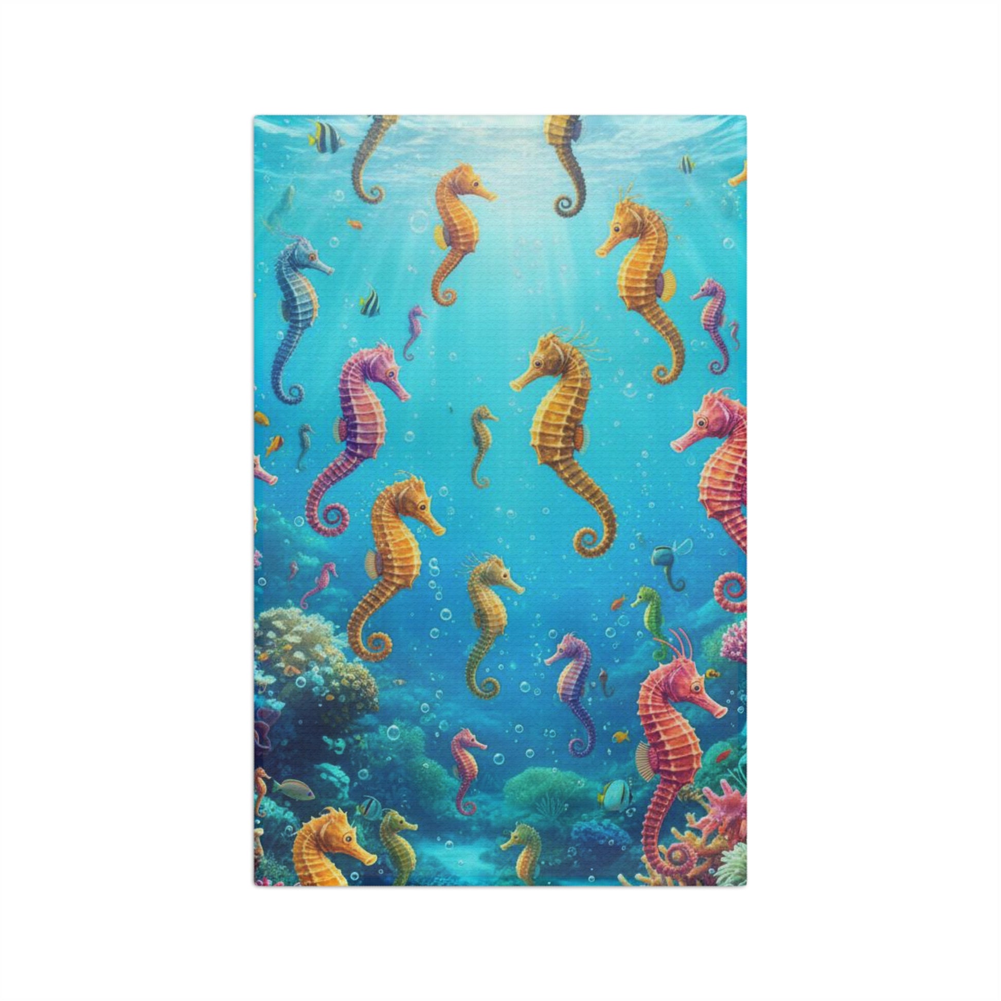 This sea horse pattern tea towel will add a touch of coastal charm to your kitchen decor. Made of 85% microfiber polyester and 15% polyamide, this towel is super absorbent and dries quickly. Perfect for sea lovers and beach enthusiasts, this tea towel is ideal for summer parties, beach house decor, and coastal-themed kitchens.